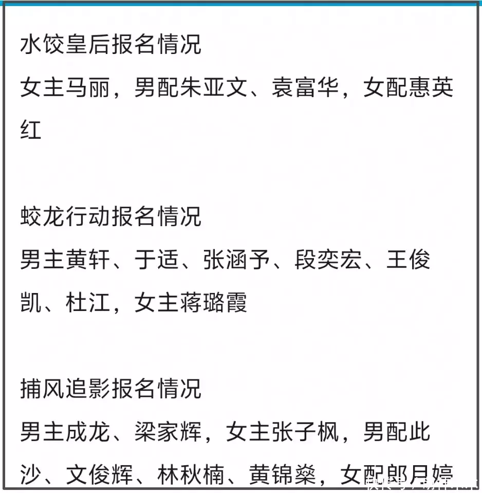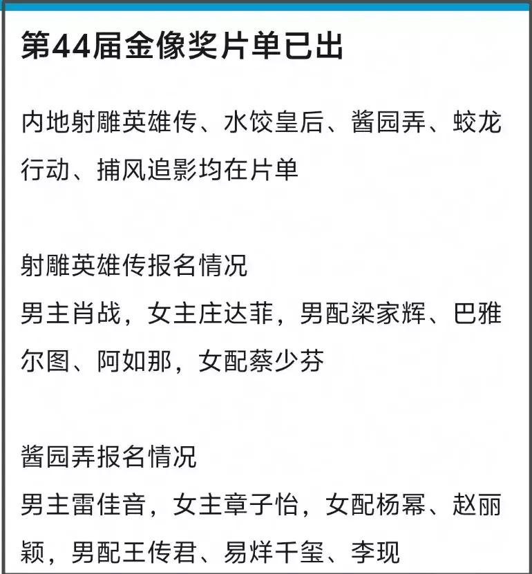 《射雕英雄传》、《酱园弄》、《水饺皇后》、《蛟龙行动》、《捕风追影》都给自家演员报了奖,杨幂、赵丽颖、蔡少芬、惠英红、郎月婷等人放在一起争提名,两大85花并非全无机会。